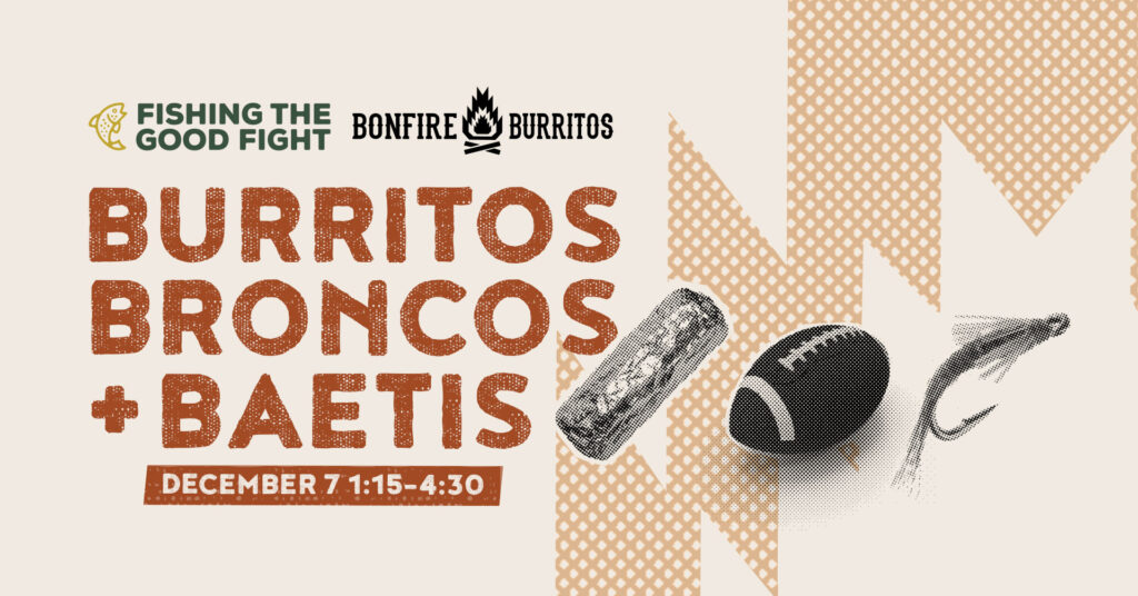 Join Fishing the Good Fight Dec 7 (1:15–4:30 PM) at Bonfire Burritos Arvada as we watch the Broncos take on the Raiders. Bring your appetite. Bring a buddy. Or bring a vice and tying supplies to spin up some flies while we watch the game. Better yet, bring all three!