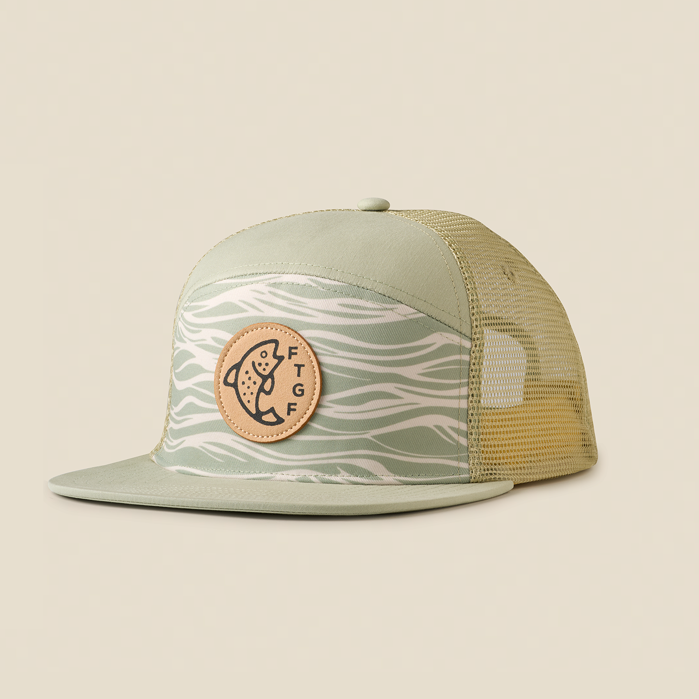 Flat-brim to keep you focused on what matters. Leather patch over sublimation printed waves and trucker mesh.