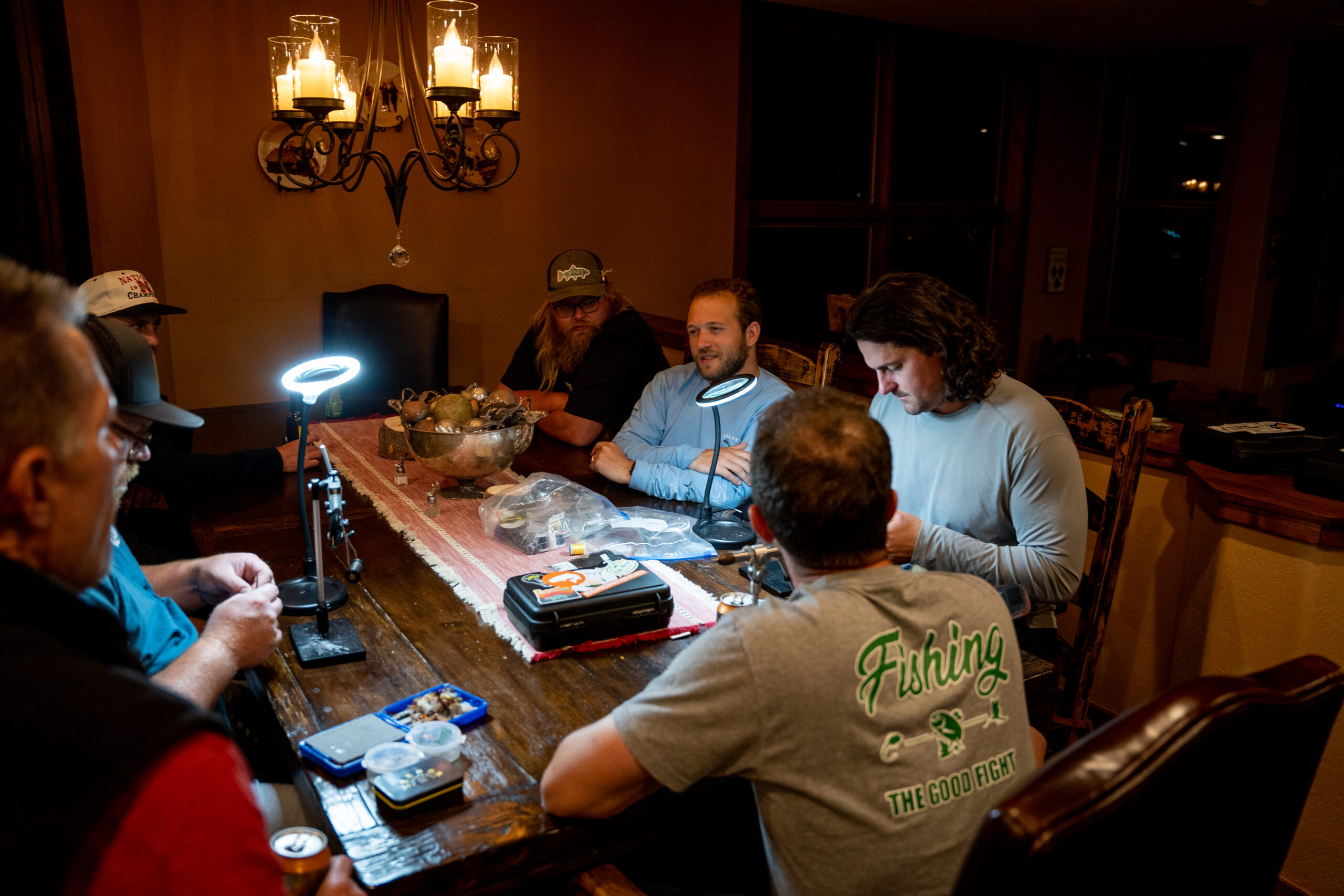 Tying nights are casual, in-person gatherings where men come together to tie flies, swap stories, and connect over a shared love of fly fishing and community. Materials are provided, and all experience levels are welcome—just show up and hang out.